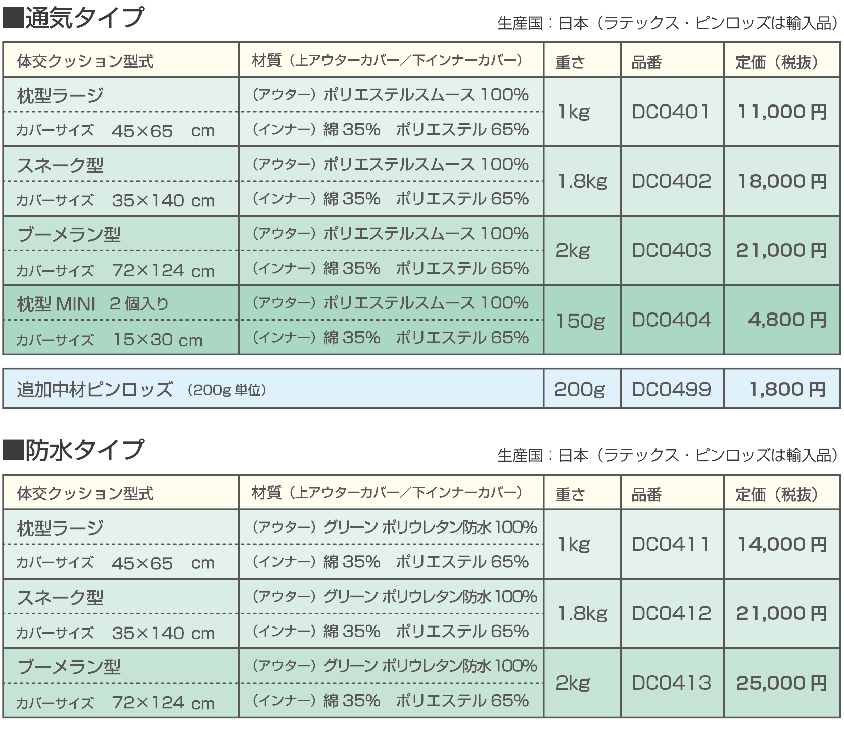 通気タイプアウターカバー:ポリエステル撥水ニット 通気タイプインナーカバー:ポリエステルメッシュ生地 防水タイプアウターカバー:ポリエステルポリカーボネイト系ポリウレタンラミネート 防水タイプインナーカバー:ポリエステルメッシュ生地 |